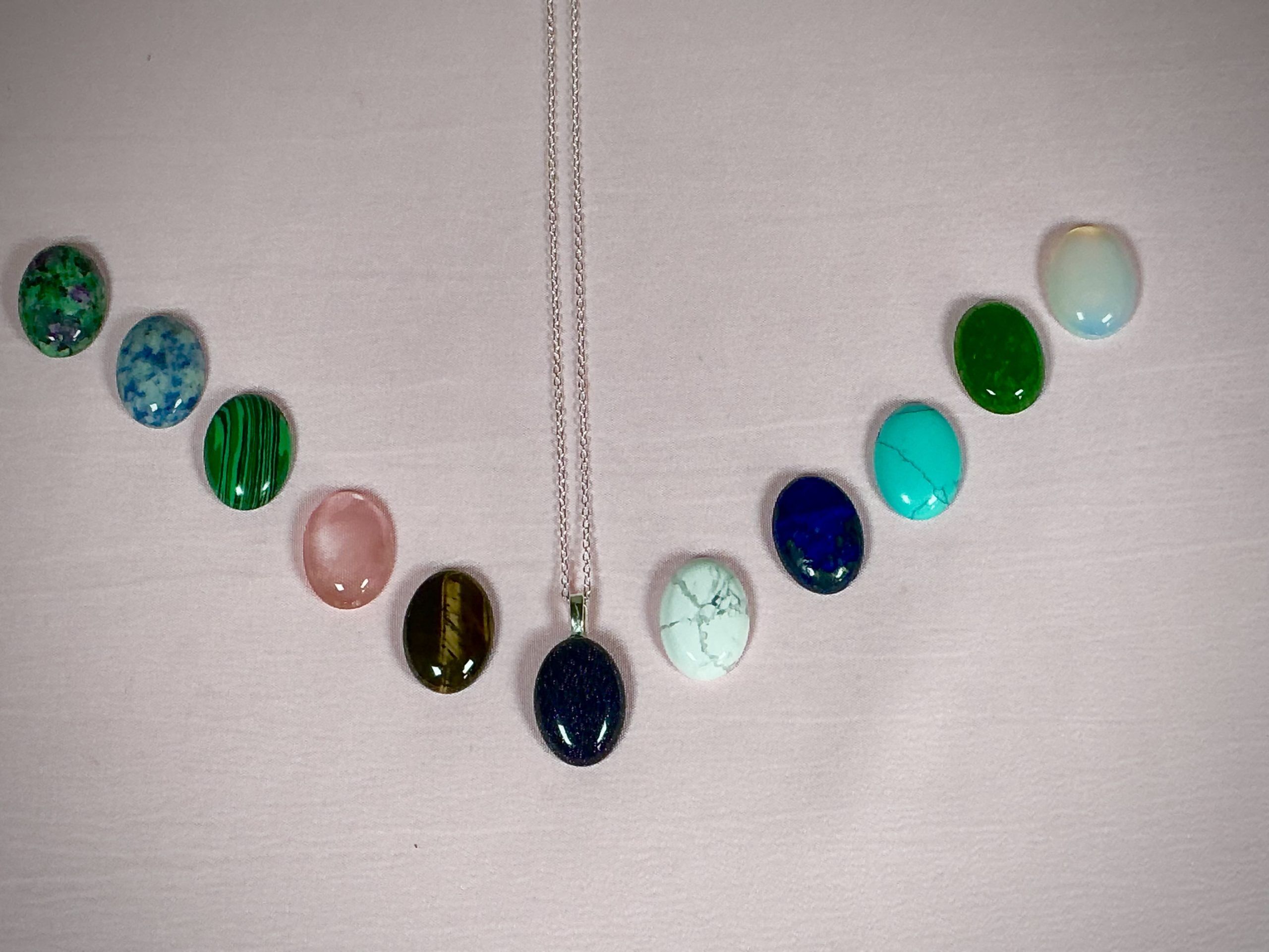 Black Obsidian, Bloodstone, Cats Eye, Dark Blue Crystal, Dumortierite, Emerald Green, Magnesite, Malachite, Opalite, Tigers Eye, Turquoise